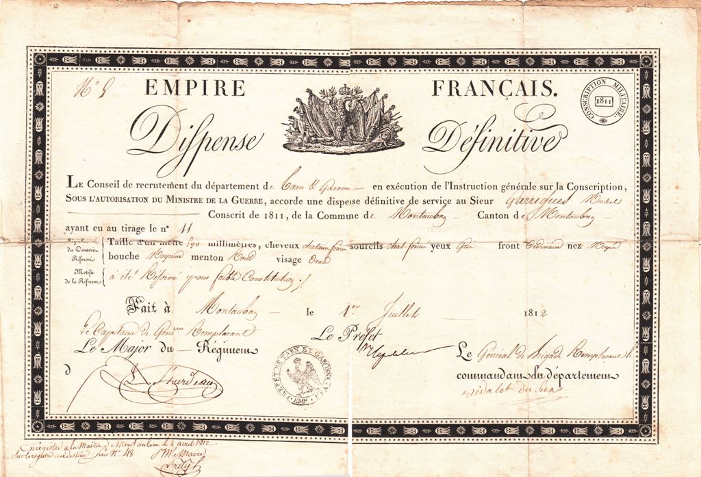 VIDALOT DU SIRAT, Pierre Marie Gabriel (Espalais 1764 – 1843). General 1794: Unterschrift als militärischer Kommandant des Departements Tarn et Garonne. Ausmusterung aus dem Militärdienst für Michel Garrigues, Rekrut des Jahres 1811, aus Montauban. Weiterhin unterzeichnet vom Präfekten des Departements Louis Honoré Félix LE PELETIER D’AUNAY (1782-1855) und einem Capitaine. MONTAUBAN, 1.7.1812. 27 x 39 cm. 1 S. auf Hadernbütten mit schöner Adlervignette und gestochener Bordüre sowie schwarzem Regimentsstempel. Faltspuren. Armée de l’Ouest 1794, vor Mainz 1795, Armée des Côtes de l’Océan 1796, ausgemustert 1797 aufgrund Beziehungen zu den Royalisten.