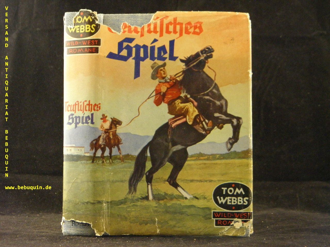 TOM WEBBS.– STORR, Robert: Teuflisches Spiel Wild-West-Roman. Leipzig (Lipsia), 1938. 269 (3) S. OLn mit OUmschl. Umschlag am Rand stärker lädiert mit Fehlstellen, NaV, sonst gutes Ex. seltene EA.