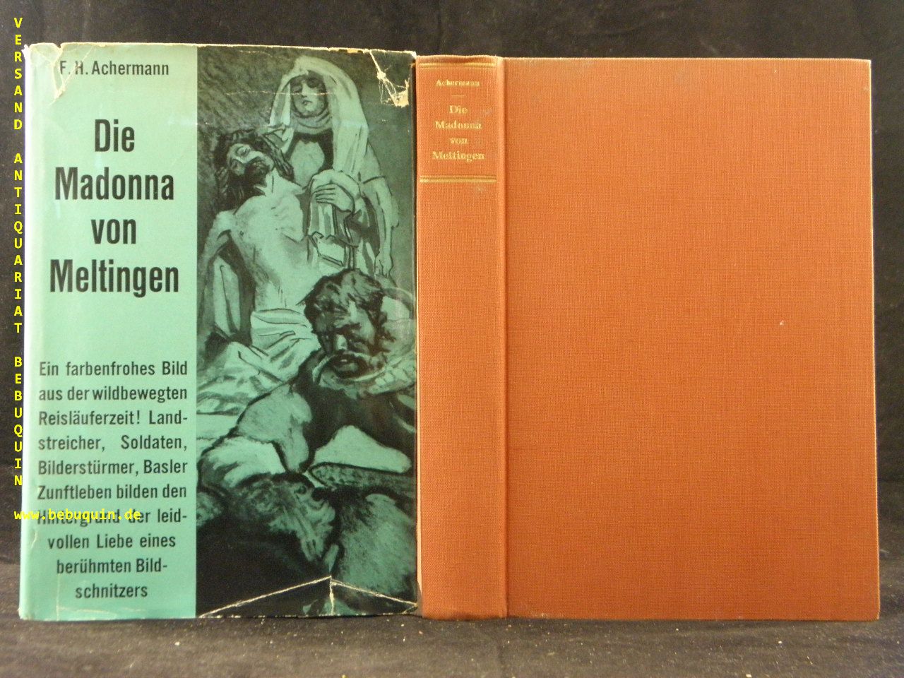 ACHERMANN, F.H.: Die Madonna von Meltingen. Historischer Roman. 13.– 17. Tsd. Olten (Walter), 1932. 311 (1) S. OLn mit OUmschl. von Willy Planck. Umschlag an den Kanten hinterlegt, sonst gutes Ex. Titel des als Schweizer Karl May bezeichneten Schriftstellers.