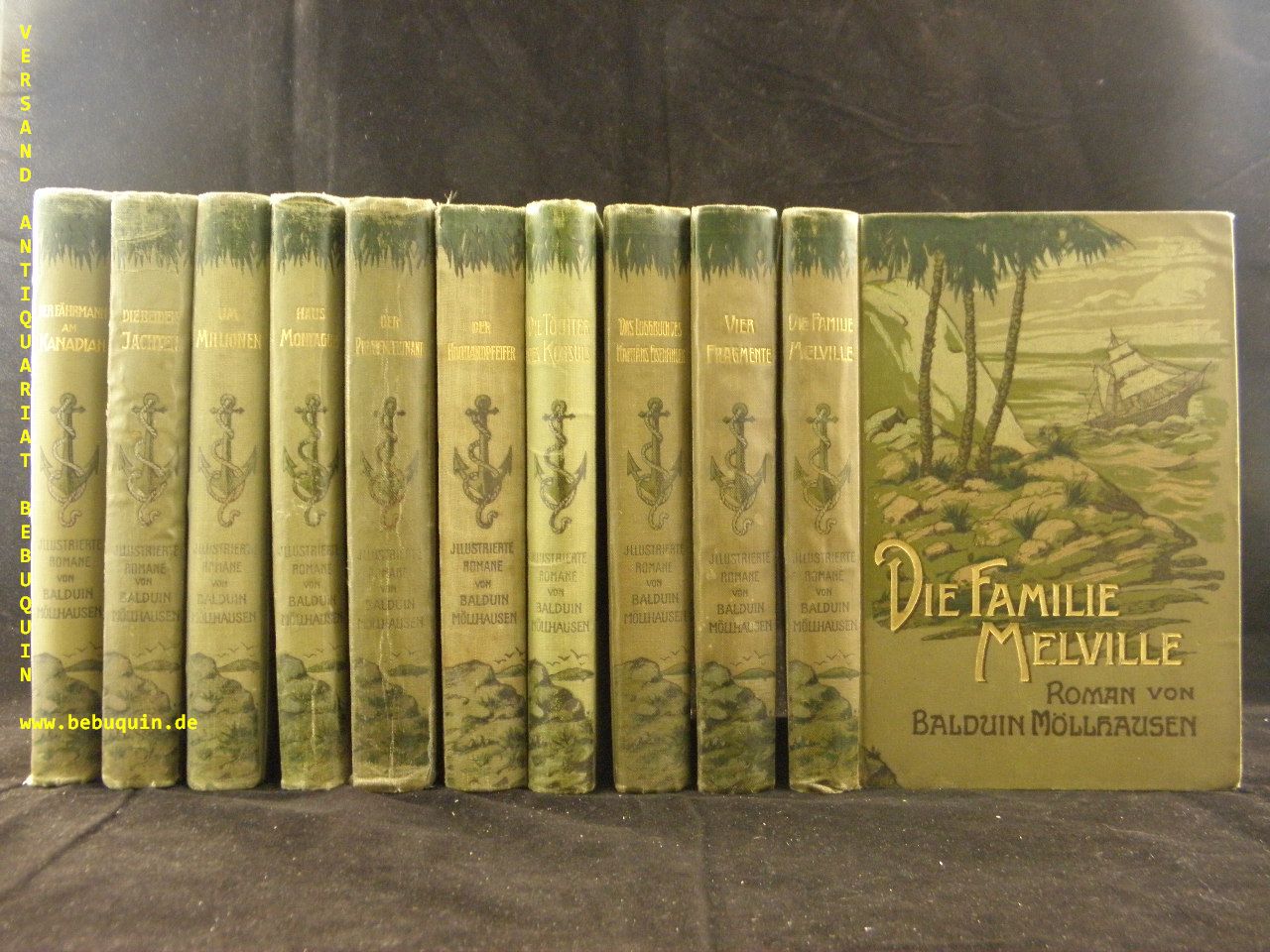 MÖLLHAUSEN, Balduin: Illustrierte Romane. Reisen und Abenteuer. Herausgegeben von Dietrich Theden. Band 1: Der Fährmann am Kanadian. Mit Titelportrait und Illustrationen von Ad. Wald. Band 2: Die beiden Jachten. Mit Illustrationen von Max Vogel. Band 3: Um Millionen. Mit Illustrationen von Joh. Gehrts. Band 4: Haus Montague. Mit Illustrationen von Fritz Bergen. Band 5: Der Piratenleutnant. Mit Illustrationen von Richard Mahn. Band 6: Der Hochlandpfeifer. Mit Illustrationen von Hans W. Schmidt. Band 7: Die Töchter des Konsuls. Mit Illustrationen von Max Vogel. Band 8: Das Loggbuch des Kapitäns Eisenfinger. Mit Illustrationen von Ad. Wald. Band 9: Vier Fragmente. Mit Illustrationen von M. Barascudts. Band 10: Die Familie Melville. Mit Illustrationen von Otto Meyer-Wegner. 10 Bände (so kompett). Leipzig (List), 1907/08. je Band ca 400 S. ill. OLn. mit dem Anker auf dem Rücken. einige Kanten leicht berieben, wenige Namenseintragungen, Reihentitel von Band 4 fehlt, Bd. 6 mit Kleberesten auf den Vorsätzen, insgesamt sehr ordentliche Ausgabe. = Erste Serie. die gesuchte und dekorative Ausgabe.