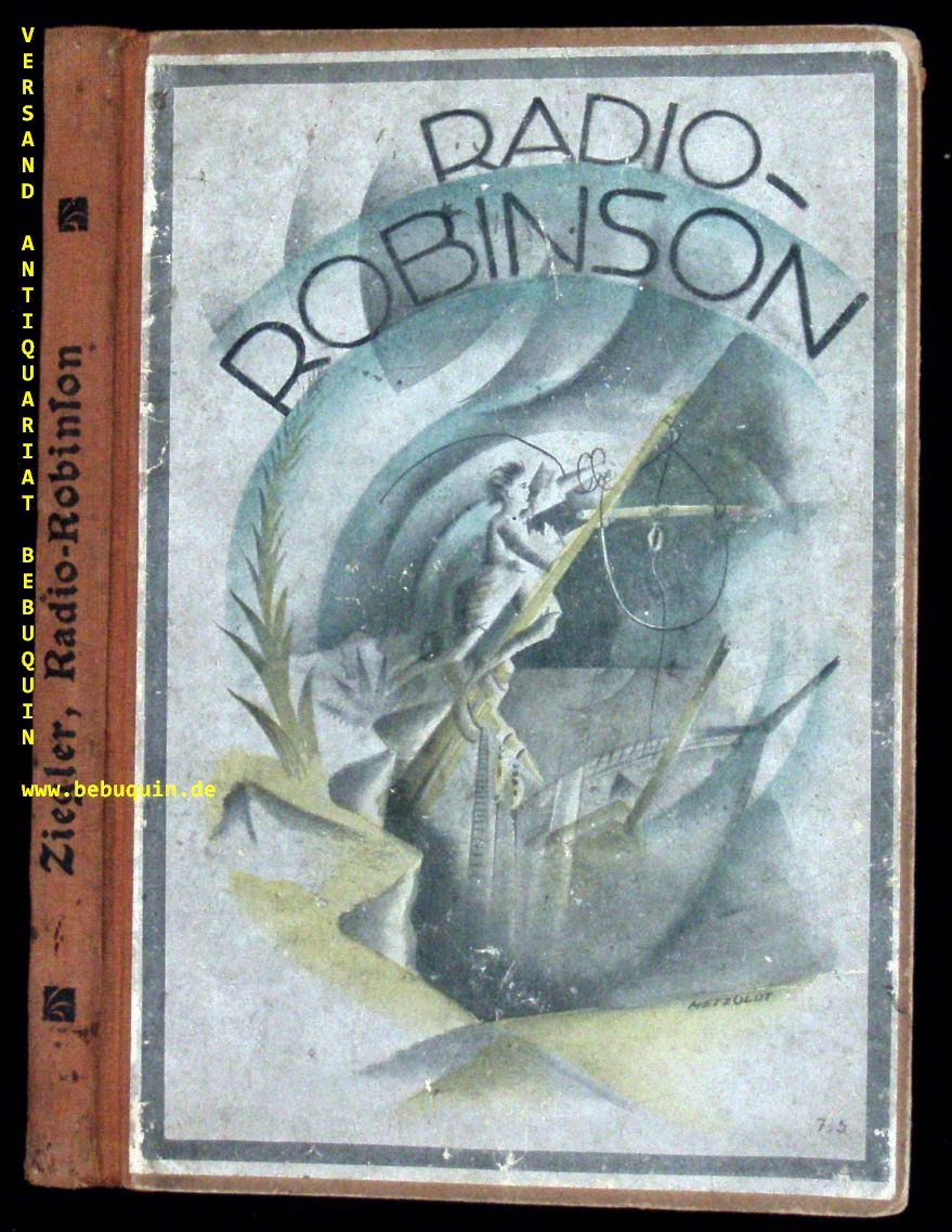 ZIEGLER, Wilhelm: Radio-Robinson. Eine moderne Robinsonade für die Jugend. Mit Anhang: Kurze Erläuterung der Grundlagen der drahtlosen Telegraphie und Telephonie. Reutlingen (Bardtenschlager), (1924). 95, 20 S. mit 1 Titelbild + zahlr. Textabb. farb. ill. OHLn. Gelenke stabilisiert. EA.