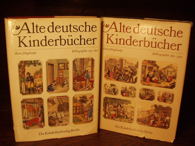 WEGEHAUPT, Heinz: Alte deutsche Kinderbücher. Bibliographie 1507 – 1900. Zugleich Bestandsverzeichnis der Kinder- und Jugendbuchabteilung der Deutschen Staatsbibliothek zu Berlin. 2 Bände. Berlin (Kinderbuch), 1979-1985. 4°. 345, 414 S. mit zahlr. z.T. ganzs. und farbigen Abb. OLn mit OUmschl. Eines der wichtigsten Kinderbuch-Verzeichnisse mit 6189 beschriebenen Titeln und umfangreichen Titel-, Autoren-, Verlags- und Illustratorenregistern.