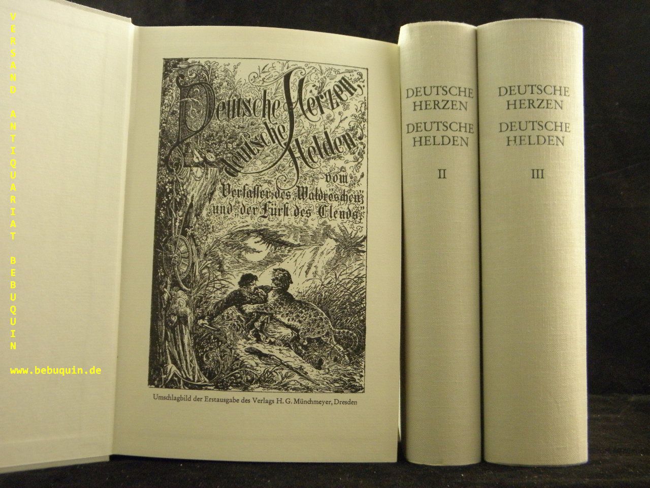 MAY.– (MAY, Karl): Deutsche Herzen, deutsche Helden. I: Eine deutsche Sultana. – II: Die Königin der Wüste. – III: Der Fürst der Bleichgesichter, 2 Bde. – IV: Der Engel der Verbannten. Reprint der Ersausgabe 1885/86. 3 Bände. Bamberg (Karl May), 1976. Gr. 8°. 2612 S. mit 107 Tafeln. OLn. gutes Ex. 1. Aufl. dieser Ausgabe.