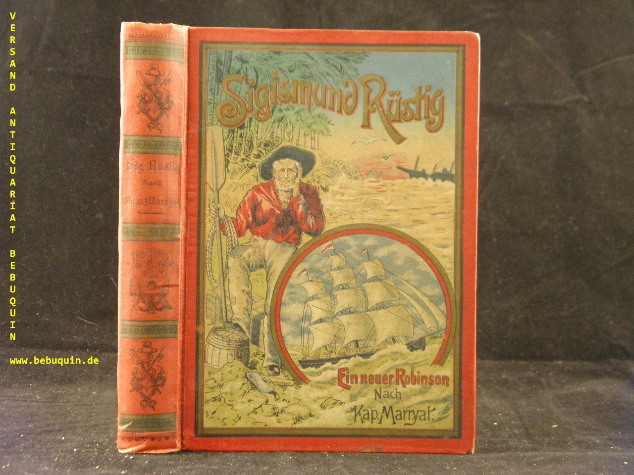 MARRYAT, Kapitän: Sigismund Rüstig der Bremer Steuermann. Ein neuer Robinson. 21. Aufl. Leipzig (Teubner), ca 1900. XI, 381 S. mit 94 Textbildern + 1 Karte. farb. ill. OLn. etwas schief gelesen und gelockert, NaV. vergl. Wegehaupt 2021; Klotz 4424/167.