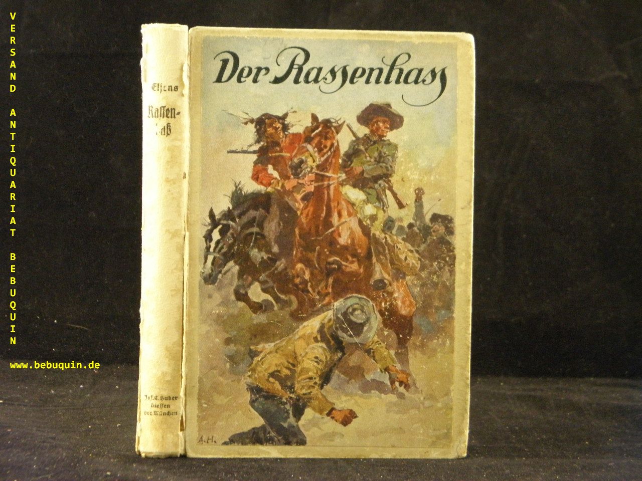 ELJENS, Olaf: Der Fluch des Rassenhasses. Reiseerzählung. Diessen (Huber), 1922. kl. 8°. 250 (2) S. mit Illustrationen von Anton Hoffmann. farb. ill. OPb. Rücken abgeplatzt, etwas angeschmutzt. EA. Klotz 1244/1.