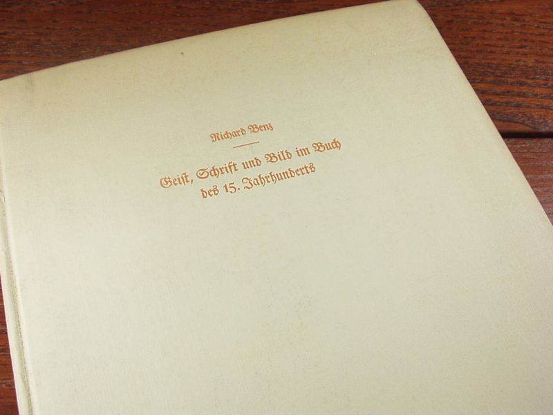 BENZ, Richard: Geist, Schrift und Bild im Buch des 15. Jahrhunderts. Hamburg (Gesellschaft der Bücherfreunde), (ca 1936). 4°. 36 S. mit 18 Abb., darunter 1 gefaltete Farbtafel sowie 2 mont. Lichtdruckabb. OPb. = Hamburger Beiträge zur Buchkunde. 1 von 300 Ex. Satz in Leibniz-Fraktur. Abgebildet werden Seiten und Ill. aus Inkunabeln, die Farbtafel zeigt das Psalterium von Fust & Schöffer, 1457.