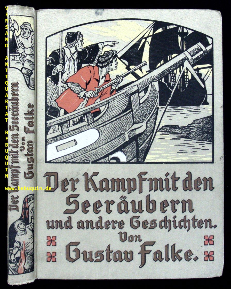 FALKE, Gustav: Der Kampf mit den Seeräubern und andere Geschichten. 14.– 17. Tsd. Reutlingen (Enßlin & Laiblin), 1929. 157 S. mit 1 farb. Titelbild + getönten Bildtafeln von L.M. Roth. farb. ill. OHLn. etwas fingerspurig. Klotz 1392/14.