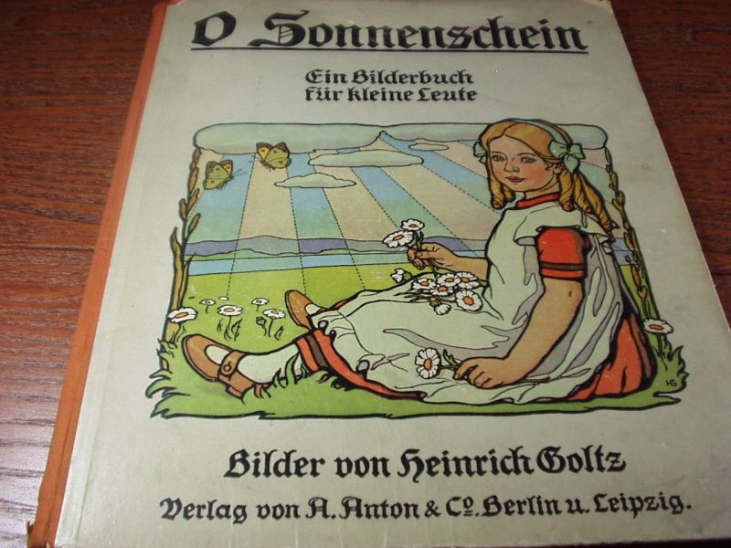 SCHLICHTEGROLL, C.F. von: O Sonnenschein scheine in’s Herz aller kleinen Leute. Ein Bilderbuch. 4. Aufl. Leipzig (Anton), 1912. 30 x 24 cm. 32 S. mit zahlr. farb. Bilder und Bildtafeln von Heinrich Goltz. farb. ill. OHLn. kaum gelockert, sonst schönes Ex. Fröhliches Bilderbuch mit pädagogischem Anspruch: Bravsein spielt hier eine wichtige Rolle. Die Drohungen bei Nichtbefolgen sind mitunter recht drastisch (Sonst kommt das Nucke-Schweinichen/ Und beißt dich in die Beinichen“). Mit den noch vom Jugendstil beeinflußten Illustrationen von Heinrich Goltz, der sonst nur ein weiteres Bilderbuch ausstattete. Ries 554.