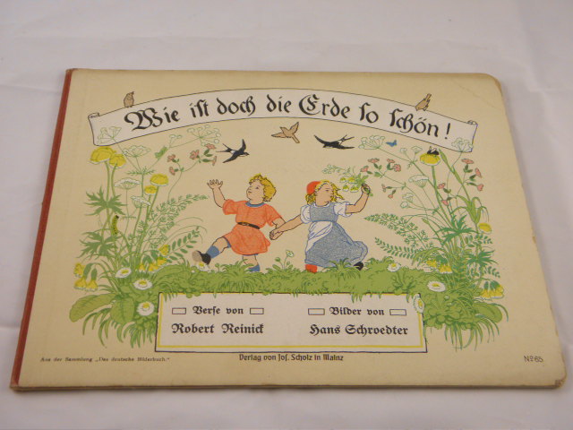 SCHOLZ DEUTSCHE BILDERBÜCHER.– REINICK, Robert: Wie ist doch die Erde so schön! Mainz (Jos. Scholz), (1909). Quer 4°. 16 S. mit 8 farb. Bildtafeln von Hans Schroedter. farb. ill. OHLn. eine Ecke mit leichter Knickspur, NaT. = No. 65. EA. Doderer-Müller 801. Ries, Wilhelminische Zeit S. 13. Klotz, Bilderbücher III, 5218/43.