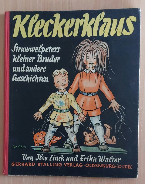 STRUWWELPETER.– LINCK, Ilse und Erika: Kleckerklaus. Struwwelpeters kleiner Bruder und 4 andere Geschichten. Oldenburg (Stalling), (1951). 4°. 8 Bl. mit farb. Bildern. farb. ill. OHLn. feines Ex. = Stalling-Bilderbücher Nr. 95/V. EA dieser gekürzten Nachkriegsausgabe. Rühle 417a.