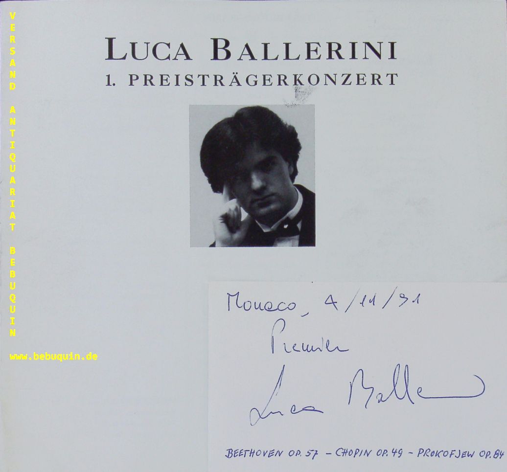 BALLERINI, Luca (Pianist): eigenhändige datierte und lokalisierte Autogrammkarte. München (Herkulessaal), 4.11.1991. 8 x 12,5 cm. Karteikarte in Original Programmheft. dieses 4 S. mit Abb. tadellos. Der Pianist Luca Ballerini spielte anstelle von Stanislav Judenitch, der sein Visum nicht rechtzeitig erhilelt.