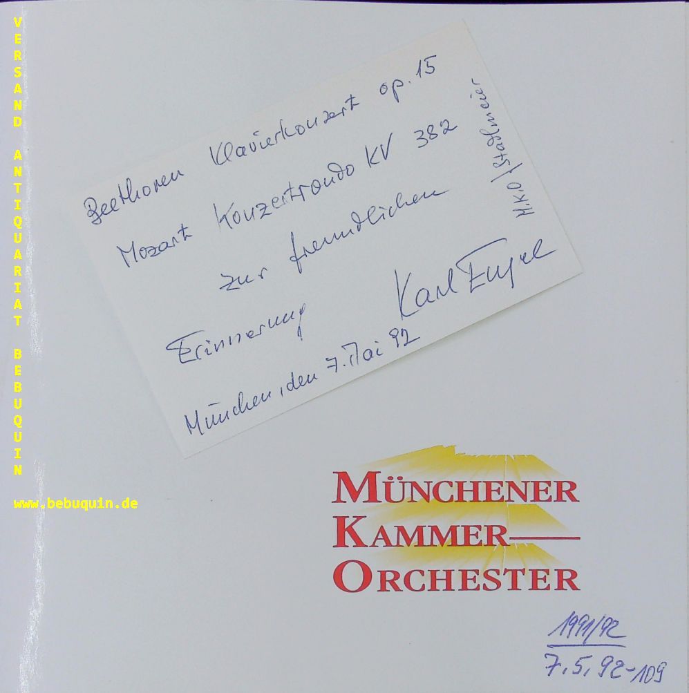 STADLMAIR, Hans (Dirigent) + ENGEL, Karl (Pianist): signierte, datierte und lokalisierte Autogrammkarte. Mit dem MKO. München (Herkulessaal), 7.5.1992. 8 x 12,5 cm. Karteikarte in Original Programmheft. dieses 8 S. mit OKart. tadellos. Hans Stadlmair (* 3. Mai 1929 in Neuhofen an der Krems in Österreich; † 13. Februar 2019 in München) war ein Dirigent und Komponist. Er war von 1956 bis 1995 künstlerischer Leiter des Münchener Kammerorchesters und dirigierte es auch bei diversen Uraufführungen.