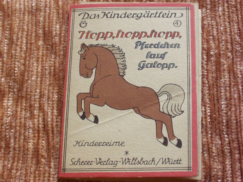 GEYER.– HOPP, HOPP, HOPP.– Pferdchen lauf Galaopp. Kinderreime. 1. und einzige Auflage. Heilbronn (Scherer), 1947. 10,5 x 7,5 cm Leporello mit 8 Bl. und farb. Bildern von Johannes Geyer. farb. ill. OKart. = Kindergärtlein 4. Überaus selten. nicht bei Mück
