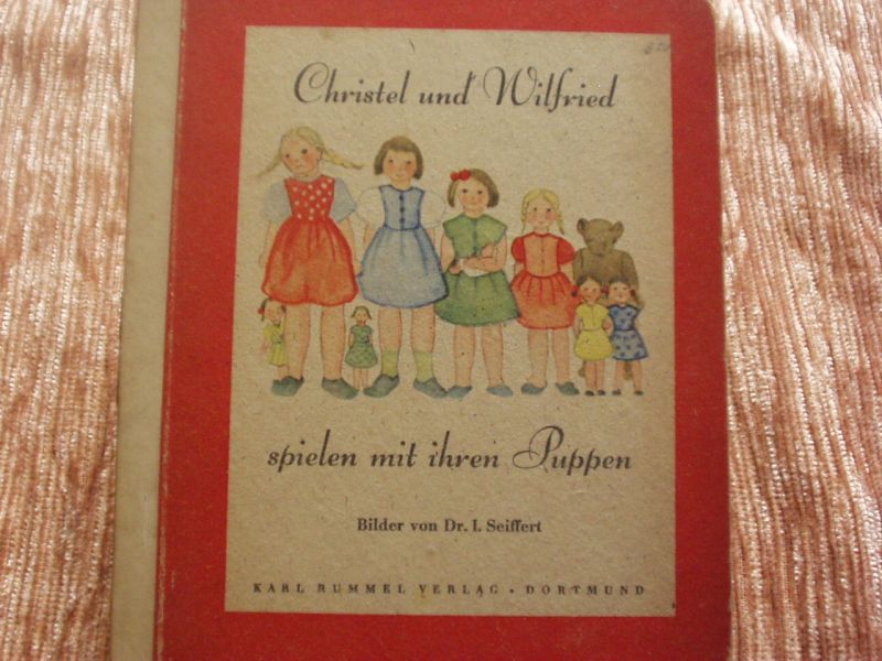 SEIFFERT, L.: Christel und Wilfried spielen mit ihren Puppen. Dortmund (Rummel), ca 1930. 19 x 16 cm. 6 Bl. stärkerer Karton mit 12 farb. Bildtafen. farb. ill. OKart. sehr seltene EA.