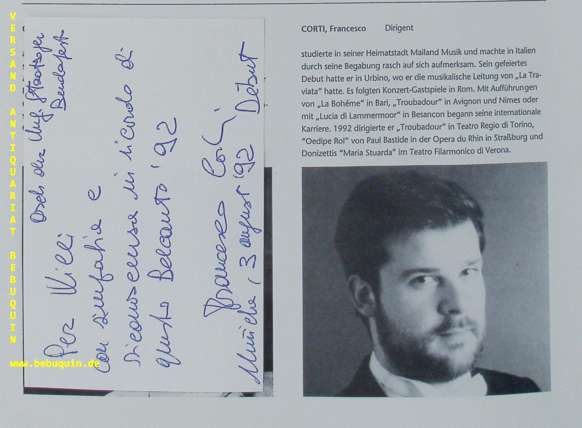 CORTI, Francesco (Dirigent): eigenhändig signierte und datierte Autogrammkarte. Belcanto 92. Von der Staatsoper Budapest. München (Philharmonie), 3.8.1992. 4°. Karteikarte in Original Programmheft. dieses mit 8 S. und zahlr. Abb. ill. OKart. und 2 inliegenden Eintrittskarten. Programm an einer Ecke bestoßen. Francesco Corti (* 17. Oktober 1963 in Mailand) ist ein italienischer Dirigent. Corti war unter anderem Generalmusikdirektor am Pfalztheater in Kaiserslautern, am Theater Magdeburg und an der Scottish Opera in Glasgow. (Wikipedia)