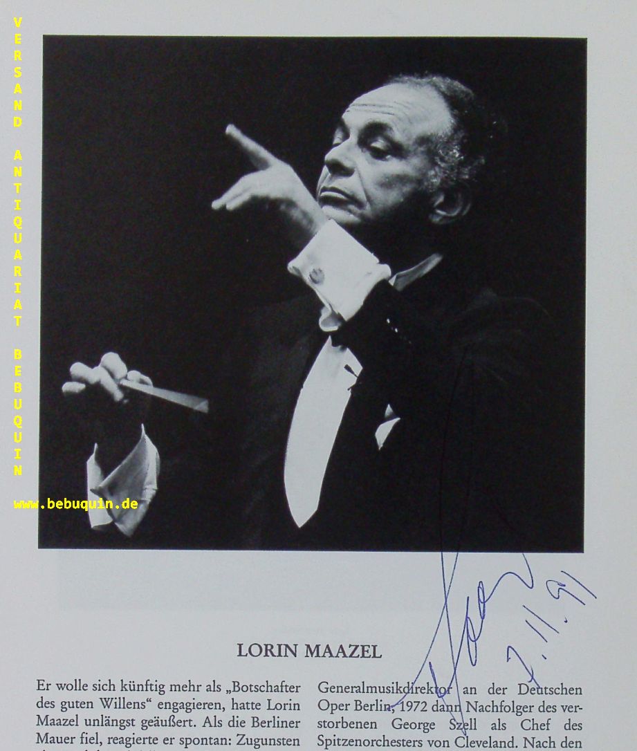 MAAZEL, Lorin (Dirigent): Programmheft mit der eigenhändigen Signatur des Dirigenten neben seinem Bild. Mit dem Symphonieorchester des BR. München (Philharmonie), 7.11.1991. Gr. 8°. 12 S. mit zahlr. Abb. + zwei Eintrittskarten beiliegend. OKart. gutes Ex. Lorin Varencove Maazel (* 6. März 1930 in Neuilly-sur-Seine, Frankreich; † 13. Juli 2014 in Castleton, Rappahannock County, Virginia) war ein US-amerikanischer Dirigent, Violinist und Komponist. (Wikipedia)
