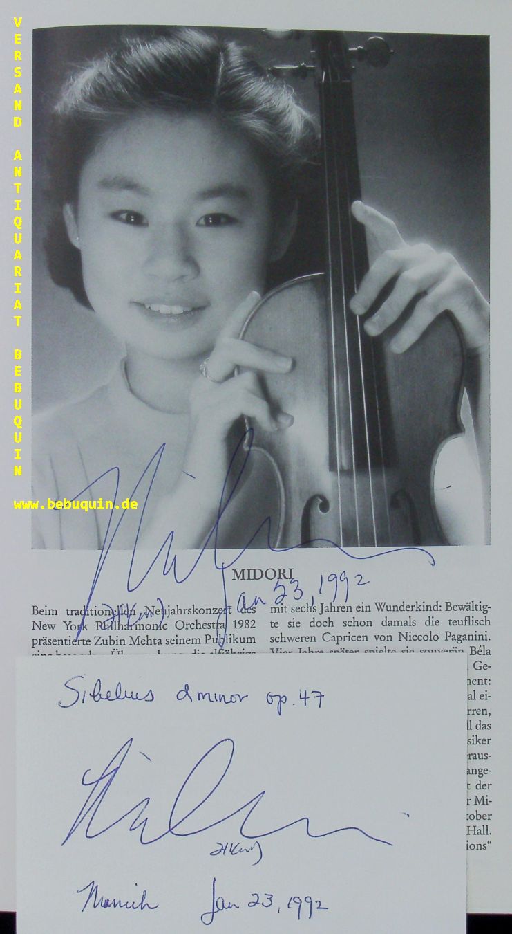 MEHTA, Zubin (Dirigent) + MIDORI (Violinistin): 2 eigenhändig datierte und signierte Autogrammkarten. Mit dem Symphonieorchester des BR. München (Philharmonie), 23.1.1992. 8 x12,5 cm. 2 Karteikarten in Programmheft (darin zusätzlich von Midori signiert). 16 S. mit zahl. Abb. OKart mit beiliegender Eintrittskarte. leicht gelockert. Midori (* 25. Oktober 1971 in Moriguchi, Präfektur Osaka) ist eine japanische Geigerin.