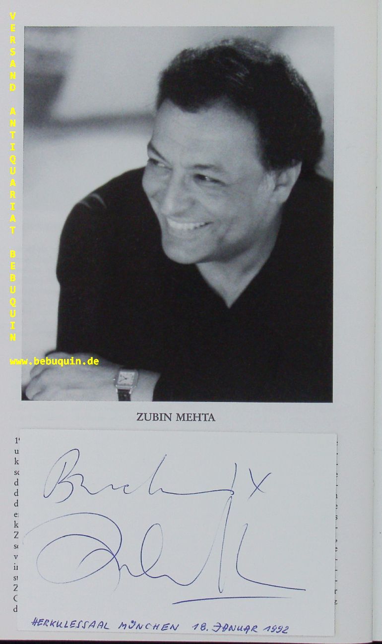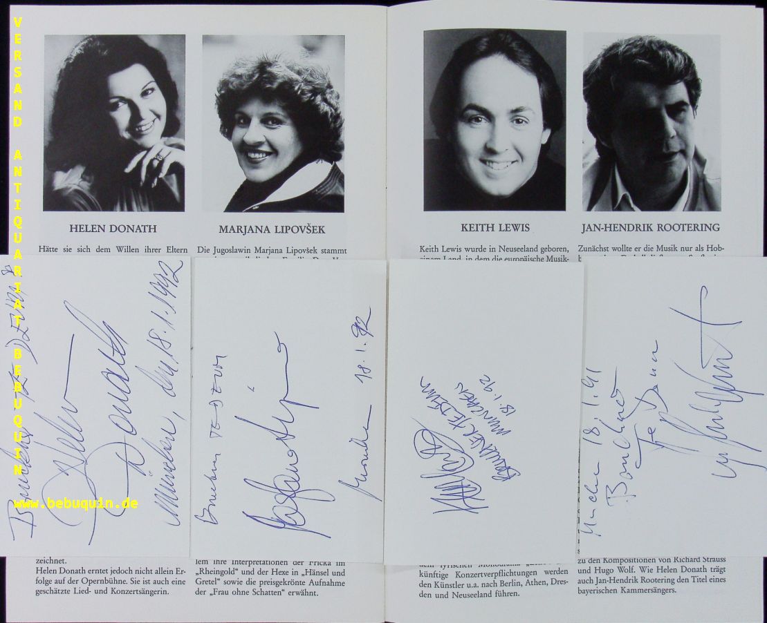 DONATH, Helen (Sopran) + MEHTA, Zubin (Dirigent) + LIPOVSEK, Marjana (Mezzosopran) + LEWIS, Keith (Tenor) + ROOTERING, Jan-Hendrik (Bass): 5 eigenhändig datierte und signierte Autogrammkarten. Mit dem Symphonieorchester des BR. München (Herkulessaal), 17.1.1992. 8 x12,5 cm. 5 Karteikarten in Programmheft. 16 S. mit zahl. Abb. OKart. tadellos Helen Donath, geborene Helen Erwin, (* 10. Juli 1940 in Corpus Christi, Texas) ist eine US-amerikanische Opernsängerin (Sopran).