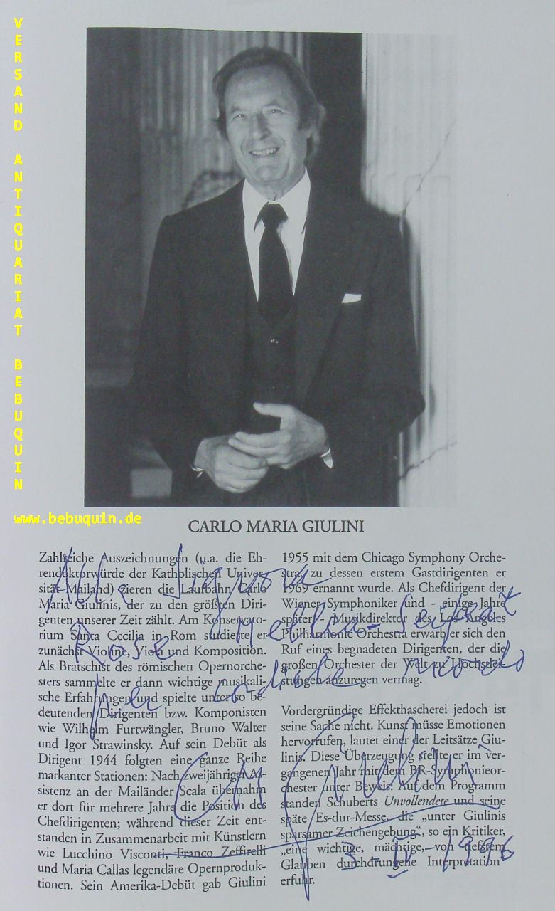 GIULINI, Carlo Maria (Dirigent): Programmheft mit einer 5zeiligen eigenhändigen persönlichen voll signierten und datierten Widmung unter dem Portraitfoto. Mit dem Symphonieorchester des BR. München (Philharmonie), 3.4.1996. Gr. 8°. 12 S. mit zahlr. Abb. OKart. gutes Ex. Carlo Maria Giulini (* 9. Mai 1914 in Barletta, Provinz Barletta-Andria-Trani; † 14. Juni 2005 in Brescia, Lombardei) war ein italienischer Dirigent.
