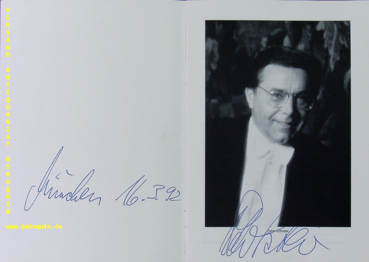 SCHREIER, Peter (Tenor): Programmheft mit eigenhändig datierter Signatur unter den Portraitfotos. Mit der Deutschen Kammerphilharmonie. München (Philharmonie), 16.3.1992. 8 S. mit zahl. Abb. OKart. tadellos = Münchner Konzertdirektion Hörtnagel. Peter Schreier (* 29. Juli 1935 in Meißen; † 25. Dezember 2019 in Dresden) war ein deutscher Sänger (Tenor) und Dirigent. (Wikipedia)