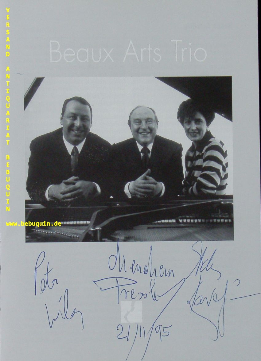 BEAUX ARTS TRIO.– PRESSLER, Menahem + KAVAFIAN, Ida + WILEY, Peter: Programmheft unter dem Foto von allen eigenhändig signiert und datiert. München (Philharmonie), 21.11.1995. 16 S. mit zahl. Abb. OKart. tadellos = Münchner Konzertdirektion Hörtnagel. Das Beaux Arts Trio war eines der bedeutendsten Klaviertrios weltweit und galt 53 Jahre als wegweisend vor allem im klassisch-romantischen Repertoire. Während seiner ganzen Existenz wurde das Trio vom Pianisten Menahem Pressler zusammengehalten. (Wikipedia)