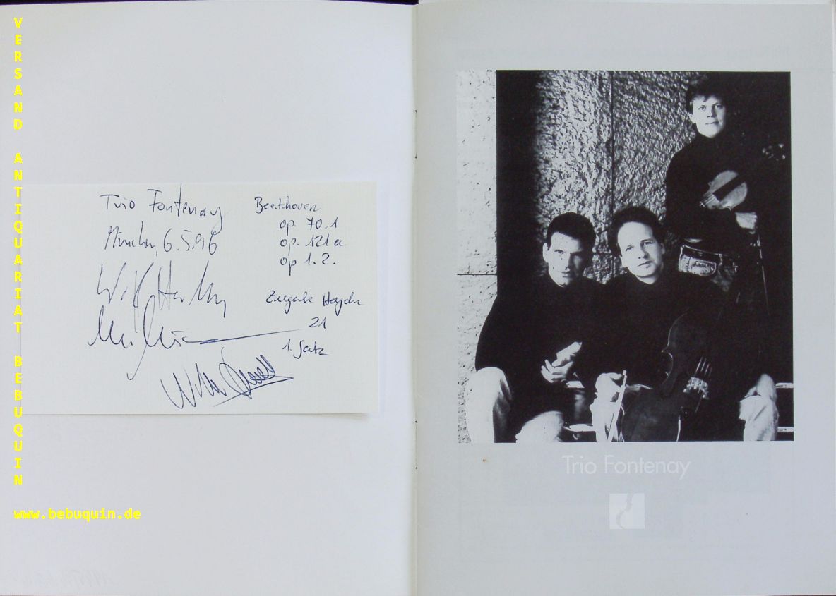 TRIO FONTENAY.– HARDEN, Wolf + MÜCKE, Michael + SCHMIDT, Niklas: eigenhändig von allen signierte und datierte Autogrammkarte. München (Herkulessaal), 25.3.1996. 8 x 12,5 cm. Karteikarten in Programmheft. 12 S. mit Abb. OKart. tadellos = Münchner Konzertdirektion Hörtnagel. Das Trio Fontenay war ein 1980 in Hamburg gegründetes und bis 2006 bestehendes Klaviertrio. In der Gründungsformation bestand es aus dem Pianisten Wolf Harden (* 1962), dem Geiger Michael Mücke (* 1962) und dem Cellisten Niklas Schmidt (* 1958). Nach dem Ausscheiden von Niklas Schmidt 1998 übernahm Jens Peter Maintz den Cellopart. (Wikipedia)