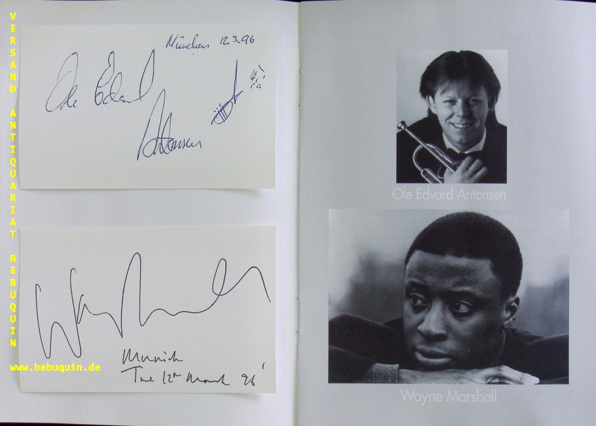 ANTONSEN, Ole Edvard (Trompeter) + MARSHALL, Wayne (Pianist): 2 eigenhändig signierte und datierte Autogrammkarten. München (Philharmonie), 12.3.1996. 8 x 12,5 cm. 2 Karteikarten in Programmheft. 12 S. mit Abb. OKart. leicht gebogen. = Münchner Konzertdirektion Hörtnagel. Ole Edvard Antonsen (* 25. April 1962 in Vang (Hedmark)) ist ein norwegischer Trompeter. Wayne Marshall (* 13. Januar 1961 in Oldham bei Manchester) ist ein englischer Pianist, Organist, Dirigent und Komponist. (Wikipedia)