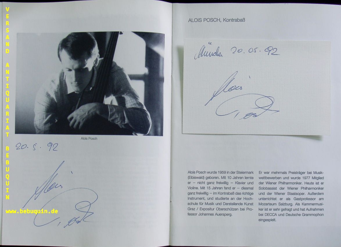 ALBAN BERG QUARTETT + LEONSKAJA, Elisabeth (Pianistin) + POSCH, Alois (Bassist): ABQ sind: Günter Pichler, Gerhard Schulz, Thomas Kakuska, Valentin Erben. Programmheft mit den eigenhändigen Signatur aller Beteiligten an ihren Portraitfotos. München (Herkulessaal), 20.5.1992. 16 S. mit zahlr. Abb. + 4 (!) eigenhändig datierte und signierte Karteikarte der Beteiligten einzeln und in Gruppen vom gleichen Termin beiliegend. OKart. gutes Ex. Das Alban Berg Quartett war eines der weltweit führenden Streichquartette. (Wikipedia)