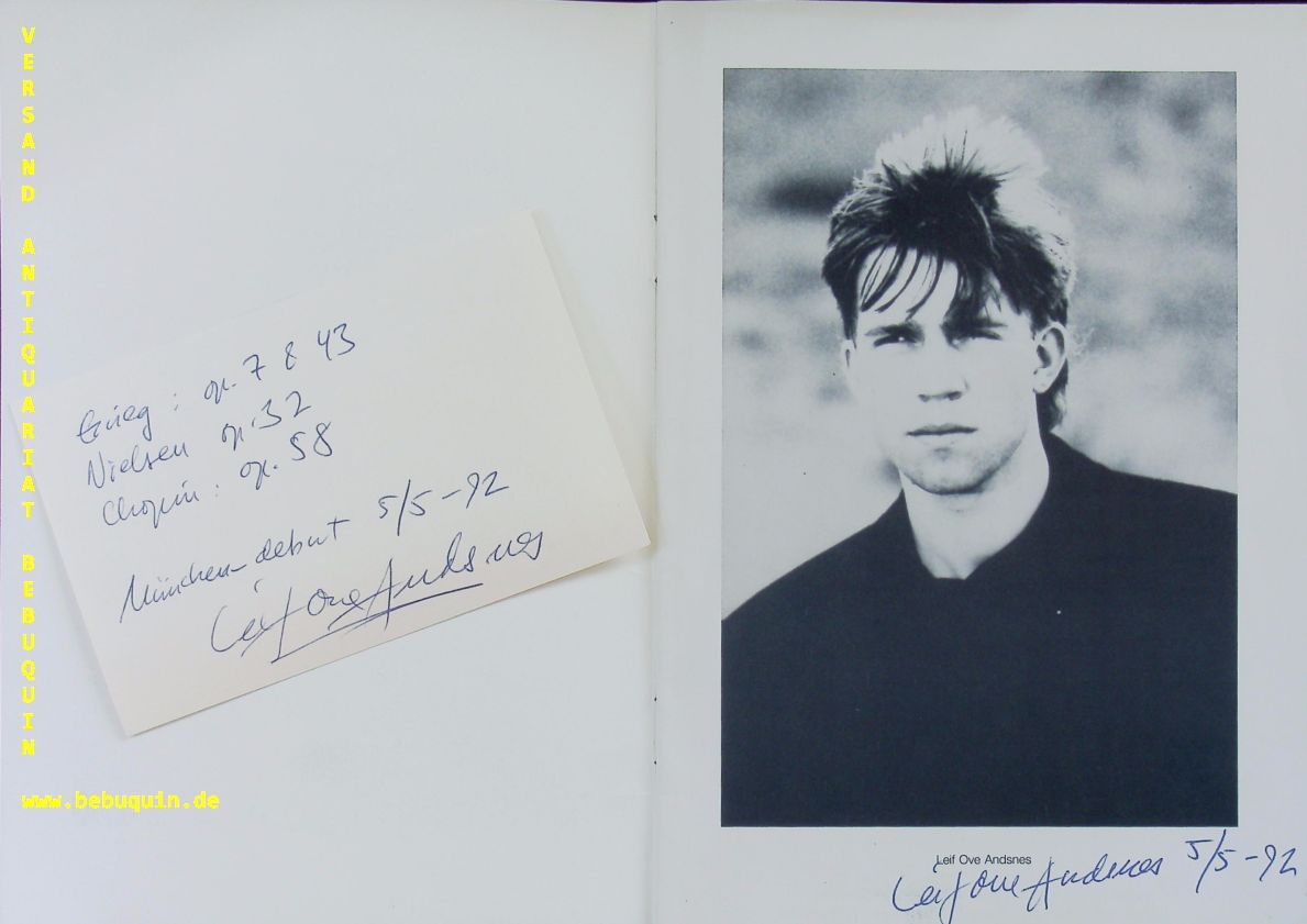 ANDSNES, Leif Ove (Pianist): eigenhändig signierte und datierte Autogrammkarte. München (Herkulessaal), 5.5.1992. 8 x 12,5 cm. Karteikarten in Programmheft. Dieses auf dem Titelportrait ebenfalls eigenhändig datiert und signiert. 2 Eintrittskarten liegen bei. 16 S. mit Abb. OKart. tadellos = Münchner Konzertdirektion Hörtnagel. Leif Ove Andsnes (* 7. April 1970 in Karmøy) ist ein norwegischer Pianist.