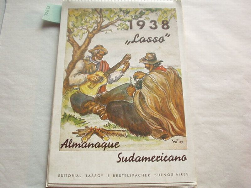 EXIL.– LASSO.– Almanaque Sudamericano. Buenos Aires (Beutelspacher), 1938. 4°. ca 60 Bl. mit Spiralbindung und über 50 thematisch vielschichtige Bilder. farb. ill. OKart mit Indios die Tee trrinken und Guitarre spielen. Sehr seltenes Dokument über die deutschsprachige Gemeinde in Südamerika, die 1938 schon zu beachtlichen Teilen aus Emigranten bestand.