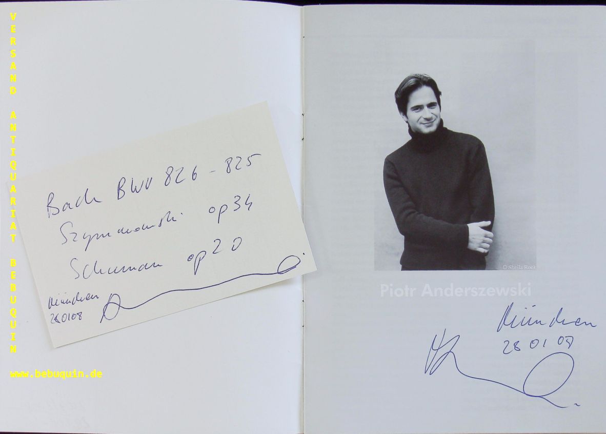 ANDERSZEWSKI, Piotr (Pianist): eigenhändig signierte und datierte Autogrammkarte. München (Herkulessaal), 28.1.2008. 8 x 12,5 cm. Karteikarte in Programmheft. darin auch zusätzlich signiert und datiert am Titelportrait. 12 S. mit zahlr. Abb. OKart. tadellos = Winderstein Konzerte. Piotr Anderszewski (* 4. April 1969 in Warschau) ist ein polnischer Pianist polnisch-ungarischer Abstammung. (Wikipedia)