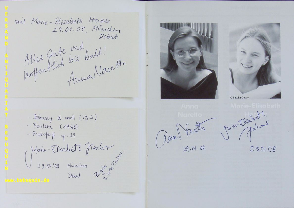 NARETTO, Anna (Pianistin) + HECKER, Marie-Elisabeth (Cellistin): 2 eigenhändig signierte und datierte Autogrammkarten. München (Herkulessaal), 29.1.2008. 8 x 12,5 cm. 2 Karteikarten in Programmheft. darin auch zusätzlich von beiden signiert und datiert an den Titelportraits. 12 S. mit zahlr. Abb. OKart. tadellos = Winderstein Konzerte. Marie-Elisabeth Hecker (* 5. März 1987 in Zwickau) ist eine deutsche Cellistin. Ihre internationale Karriere begann im Jahr 2005 mit dem Gewinn des Rostropowitsch-Wettbewerbs in Paris. (Wikipedia)