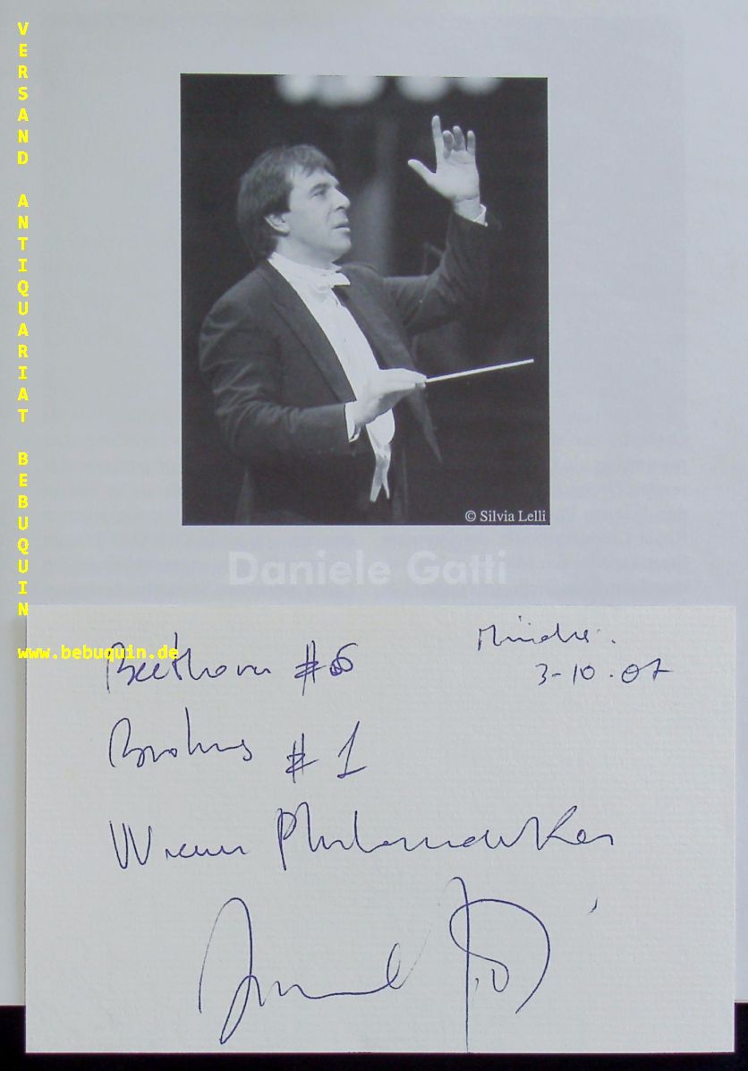 GATTI, Daniele (Dirigent): eigenhändig signierte und datierte Autogrammkarte. München (Philharmonie), 3.10.2007 8 x 12,5 cm. Karteikarte in Programmheft. 16 S. mit zahlr. Abb. OKart. tadellos = Winderstein Konzerte. Daniele Gatti (* 6. November 1961 in Mailand) ist ein italienischer Dirigent. (Wikipedia)