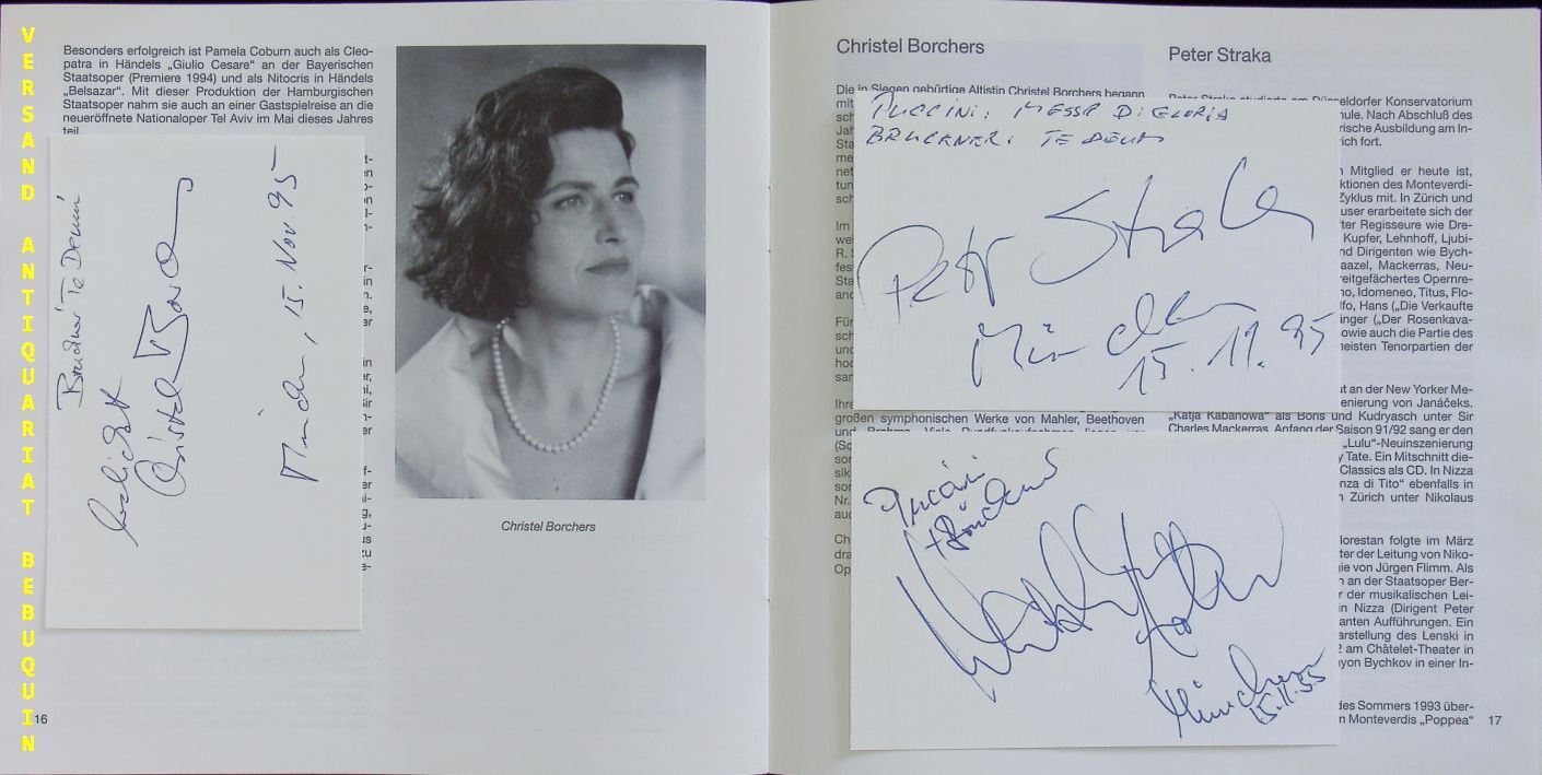 KITAJENKO, Dmitrij (Dirigent) + COBURN, Pamela (Sopran) + BORCHERS, Christl (Alt) + STRAKA, Peter (Bass): 5 eigenhändig signierte und datierte Autogrammkarten. München (Philharmonie), 15.11.1995. 8 x 12,5 cm. 5 Karteikarten in Programmheft. 20 S. mit zahlr. Abb. OKart. anbei 1 Eintrittskarte tadellos = Münchner Philharmonie Dmitri Georgijewitsch Kitajenko (* 18. August 1940 in Leningrad (heute Sankt Petersburg), Sowjetunion) ist ein russischer Dirigent.