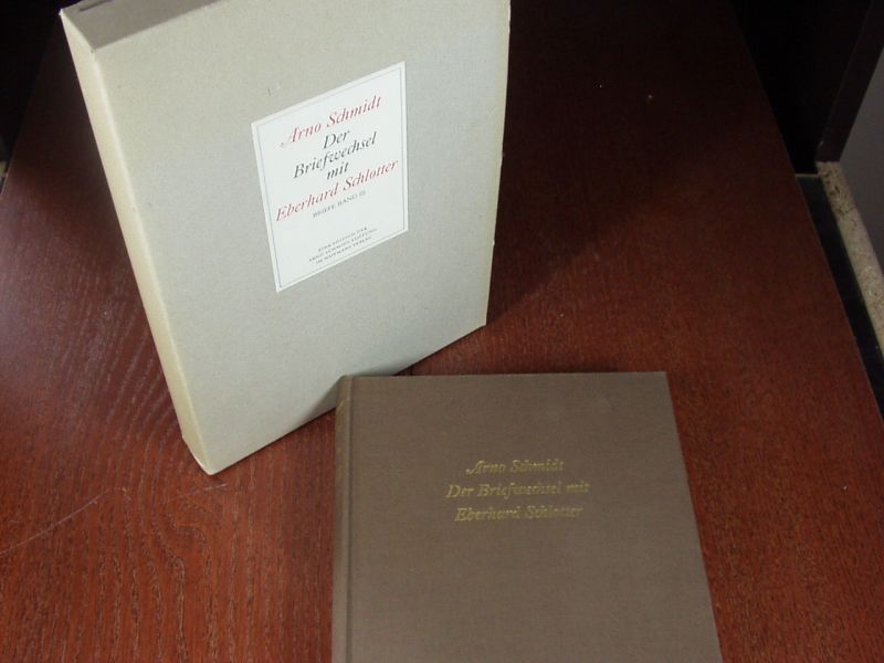 SCHLOTTER.– SCHMIDT, Arno: Der Briefwechsel mit Eberhard Schlotter. Mit einigen Briefen von und an Alice Schmidt und Dorothea Schlotter. Hrsg. von Bernd Rauschenbach. Zürich (Haffmann), 1991. 4°. 367 S. mit 1 Titelportrait. OLn mit goldgeprägter Deckelbeschriftung in OSchuber. = Briefe, Band III. EA (d.i. 1.– 4. Tsd) mit der eigenhändigen Signatur Schlotters auf Vortitel.
