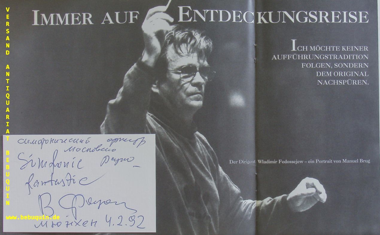 FEDOSSEJEW, Wladimir (Dirigent) + BRAUNSTEIN, Guy (Violonist): 2 eigenhändig signierte und datierte Autogrammkarten. Mit Moskauer Radio Sinfonieorchester. München (Philharmonie), 4.2.1992. 8 x 12,5 cm. 2 Karteikarten in Programmheft. 12 S. mit zahlr. Abb. OKart. tadellos = Winderstein Konzerte. Wladimir Iwanowitsch Fedossejew (* 5. August 1932 in Leningrad) ist ein russischer Dirigent. Guy Braunstein (* 27. August 1971 in Tel Aviv, Israel) ist ein israelischer Violinist. Er war von 2000 bis 2013 Erster Konzertmeister der Berliner Philharmoniker. (Wikipedia)