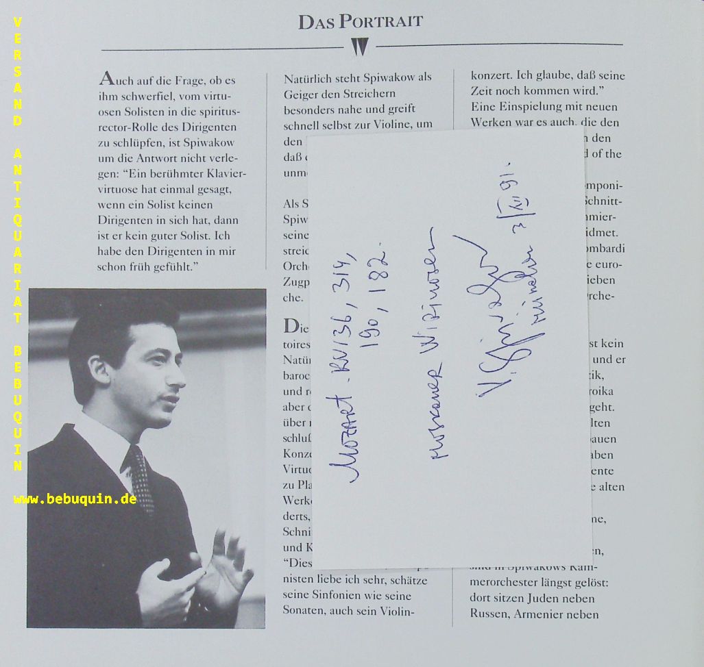 SPIWAKOW, Wladimir (Dirigent): eigenhändig signierte und datierte Autogrammkarte. Mit Moskauer Virtuosen. München (Philharmonie), 3.12.1991. 8 x 12,5 cm. Karteikarte in Programmheft. 12 S. mit zahlr. Abb. OKart. tadellos = Winderstein Konzerte. Wladimir Teodorowitsch Spiwakow (* 12. September 1944 in Ufa, Sowjetunion) ist ein russischer Geiger und Dirigent. Seit 1989 leitet er das Internationale Musikfestival von Colmar. Er ist zudem musikalischer Direktor und Chefdirigent der 2003 gegründeten Russischen Nationalphilharmonie sowie Präsident des Moskauer Internationalen Hauses der Musik (Wikipedia)