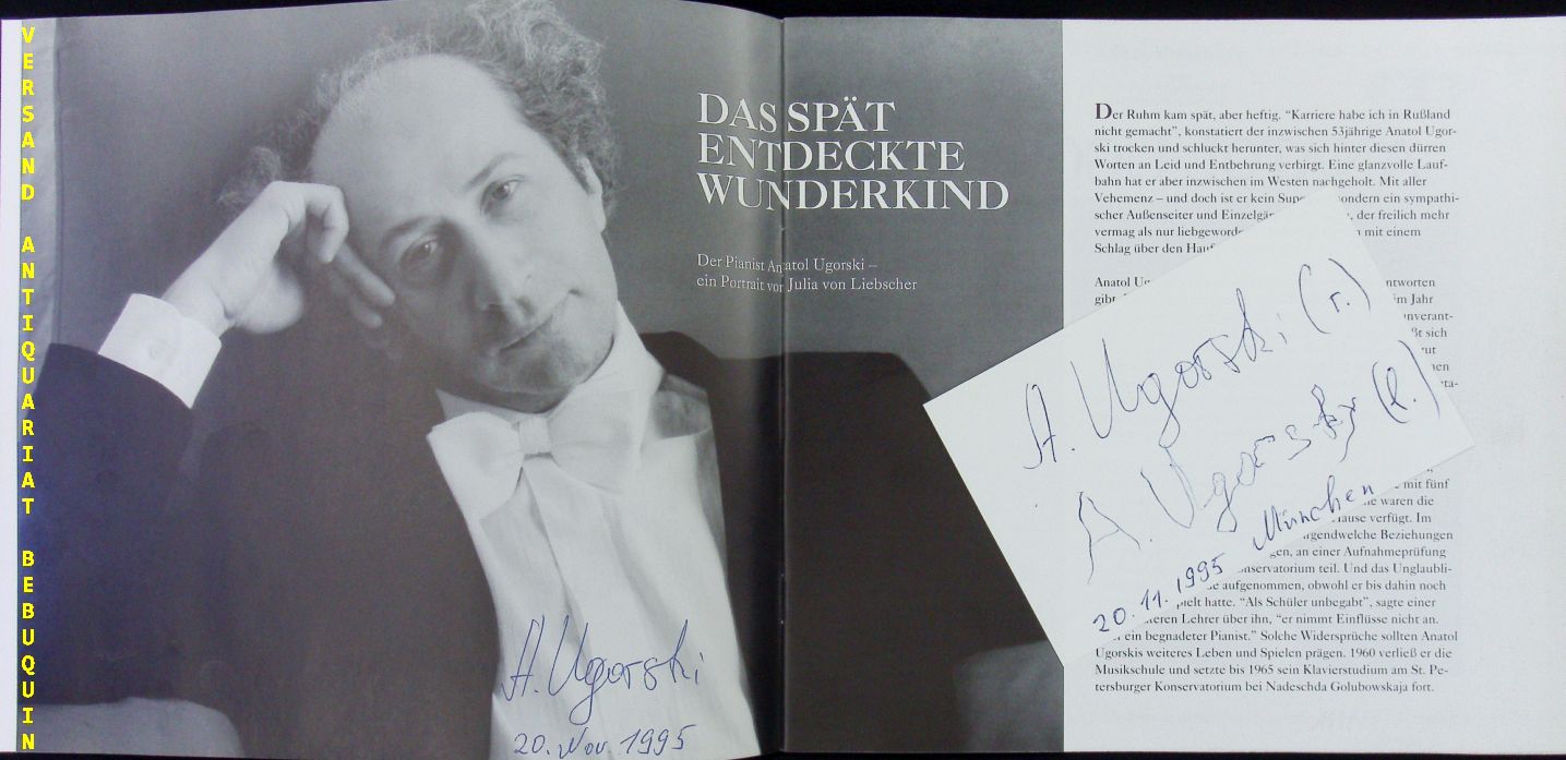 UGORSKI, Anatol (Pianist): eigenhändig zweifach (mit linker und rechter Hand) signierte und datierte Autogrammkarte. Ein Kuriosum! München (Philharmonie), 20.11.1995. 8 x 12,5 cm. Karteikarten in Programmheft. Dieses ebenfalls auf dem Portraitbild eigenhändig signiert und datiert. 16 S. mit zahlr. Abb. OKart. tadellos = Winderstein Konzerte. Anatol Ugorski (* 28. September 1942 in Rubzowsk, Sibirien) ist ein russischer Pianist, der seit 1990 in Deutschland lebt und international gastiert. Anatol Ugorski kam als viertes von fünf Geschwistern zur Welt. 1945 zogen die Eltern nach Leningrad. Dort wurde er mit sechs Jahren in die an das Konservatorium angegliederte Spezialmusikschule aufgenommen, obwohl er nur singen und Xylophon spielen konnte. (…) Bei einem Leningrader Gastspiel von Pierre Boulez, das in einer Zeit relativer kultureller Offenheit vor dem Prager Frühling arrangiert worden war und dann im Herbst 1968 (kurz nach dem Einmarsch von Truppen des Warschauer Pakts) stattfand, wurde sein begeisterter Applaus als politische Demonstration gedeutet. Er musste sich vor einem Komitee verantworten. Da man ihn aufgrund seiner Liebe zur zeitgenössischen Musik für politisch unzuverlässig hielt, wurde er an der Fortsetzung seiner Karriere gehindert und konnte mehr als zehn Jahre lang nur vor Schulklassen in der sowjetischen Provinz auftreten.