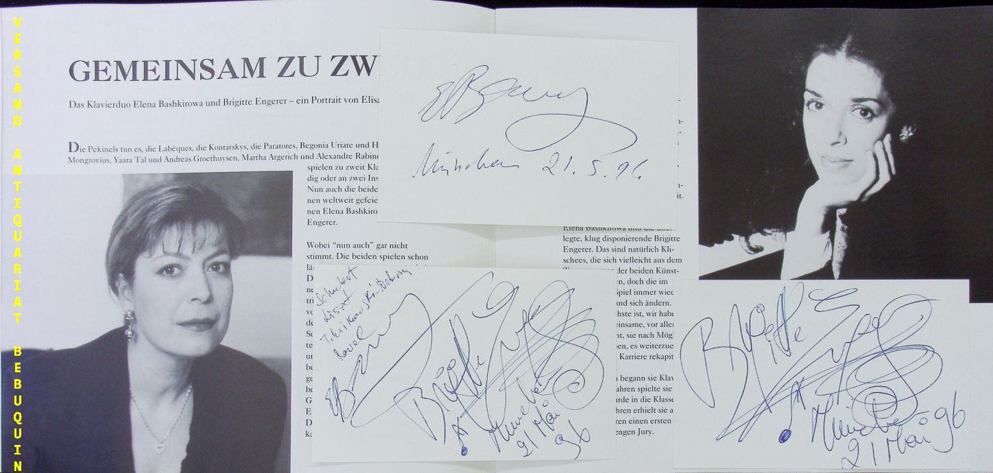 BASHKIROVA, Elena (Pianistin) + ENGERER, Brigitte (Pianistin): 3 eigenhändig signierte und datierte Autogrammkarte. (jeweils einzeln und zusammen) München (Philharmonie), 21. 5.1996. 8 x 12,5 cm. 3 Karteikarten in Programmheft. 12 S. mit zahlr. Abb. OKart. leicht gewellt. = Winderstein Konzerte. Jelena Dmitrijewna Baschkirowa (* 1958 in Moskau) ist eine russische Pianistin, Mitgründerin des Metropolis Ensemble Berlin und künstlerische Leiterin des Jerusalemer Kammermusikfestivals (International Jerusalem Chamber Music Festival). Brigitte Engerer (* 27. Oktober 1952 in Tunis; † 23. Juni 2012 in Paris) war eine französische Pianistin. (Wikipedia)