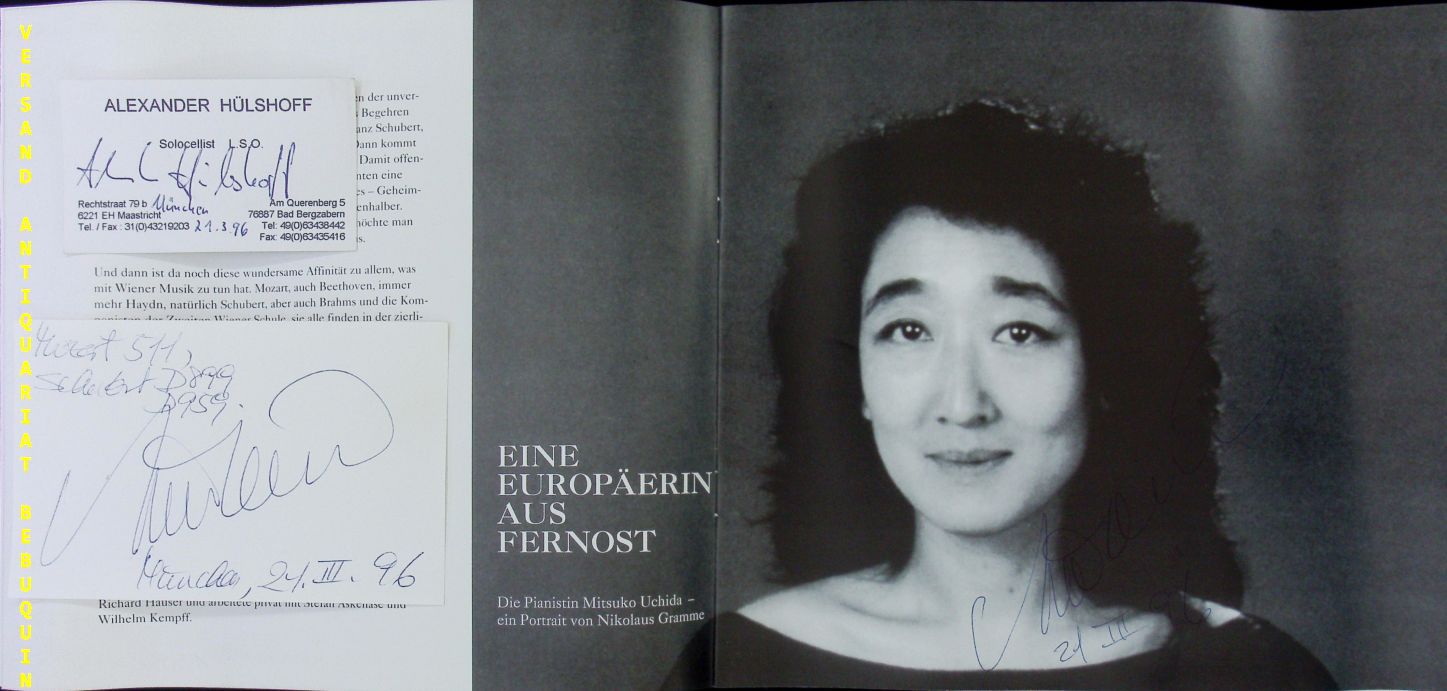 UCHIDA, Mitsuko (Pianist): eigenhändig signierte und datierte Autogrammkarte. München (Herkulessaal), 27.3.1996. 8 x 12,5 cm. Karteikarte in Programmheft. Dieses mit eigenhändiger Signatur auf dem Titelportrait. Außderdem dabei die Visitenkarte von Solocellist Alexander Hülhoff. 12 S. mit zahlr. Abb. OKart. leicht gewellt. = Winderstein Konzerte. Dame Mitsuko Uchida (* 20. Dezember 1948 in Atami) ist eine britische Pianistin japanischer Herkunft. (Wikipedia)