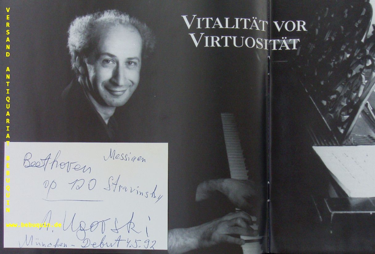 UGORSKI, Anatol (Pianist): eigenhändig signierte und datierte Autogrammkarte. München (Philharmonie), 4.5.1992. 8 x 12,5 cm. Karteikarten in Programmheft. Dabei eine Eintrittskarte. 12 S. mit zahlr. Abb. OKart. tadellos = Winderstein Konzerte. Anatol Ugorski (* 28. September 1942 in Rubzowsk, Sibirien) ist ein russischer Pianist, der seit 1990 in Deutschland lebt und international gastiert. Anatol Ugorski kam als viertes von fünf Geschwistern zur Welt. 1945 zogen die Eltern nach Leningrad. Dort wurde er mit sechs Jahren in die an das Konservatorium angegliederte Spezialmusikschule aufgenommen, obwohl er nur singen und Xylophon spielen konnte. (…) Bei einem Leningrader Gastspiel von Pierre Boulez, das in einer Zeit relativer kultureller Offenheit vor dem Prager Frühling arrangiert worden war und dann im Herbst 1968 (kurz nach dem Einmarsch von Truppen des Warschauer Pakts) stattfand, wurde sein begeisterter Applaus als politische Demonstration gedeutet. Er musste sich vor einem Komitee verantworten. Da man ihn aufgrund seiner Liebe zur zeitgenössischen Musik für politisch unzuverlässig hielt, wurde er an der Fortsetzung seiner Karriere gehindert und konnte mehr als zehn Jahre lang nur vor Schulklassen in der sowjetischen Provinz auftreten.