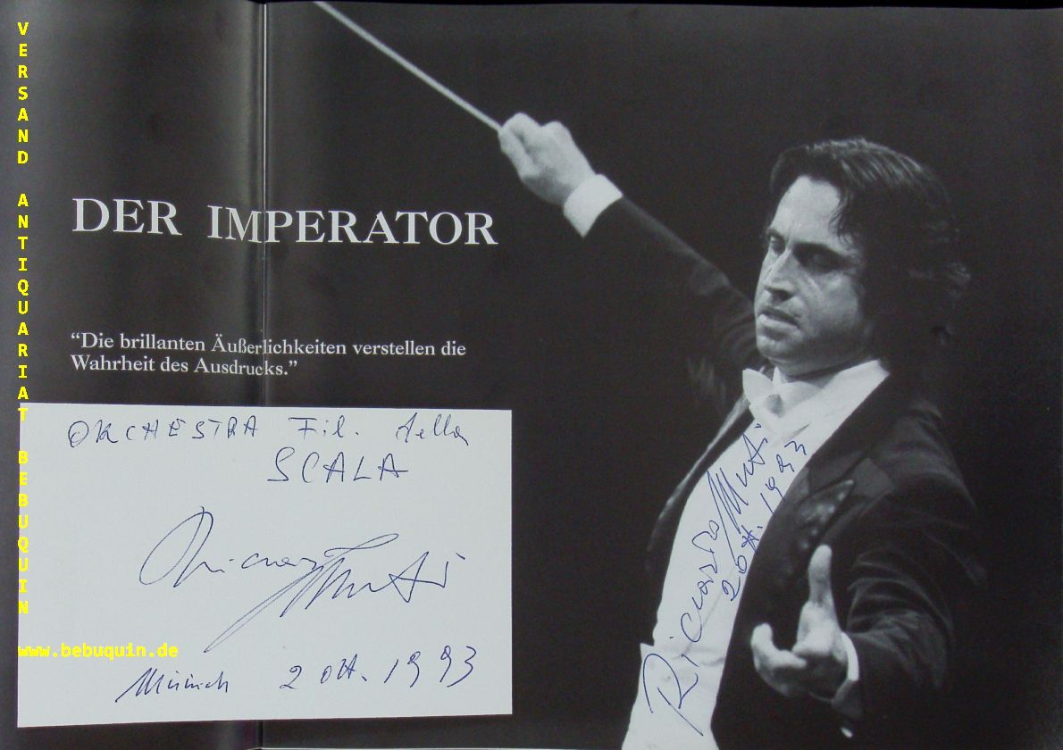 MUTI, Riccardo (Dirigent): eigenhändig signierte und datierte Autogrammkarte. München (Philharmonie), 2.10.1993. 8 x 12,5 cm. Karteikarte in Programmheft. Zusätzliche datierte Signatur auf Titelportrait. Eintrittskarte anbei. 16 S. mit zahlr. Abb. OKart. tadellos. = Winderstein Konzerte. Riccardo Muti (* 28. Juli 1941 in Neapel) ist ein italienischer Dirigent. (Wikipedia)
