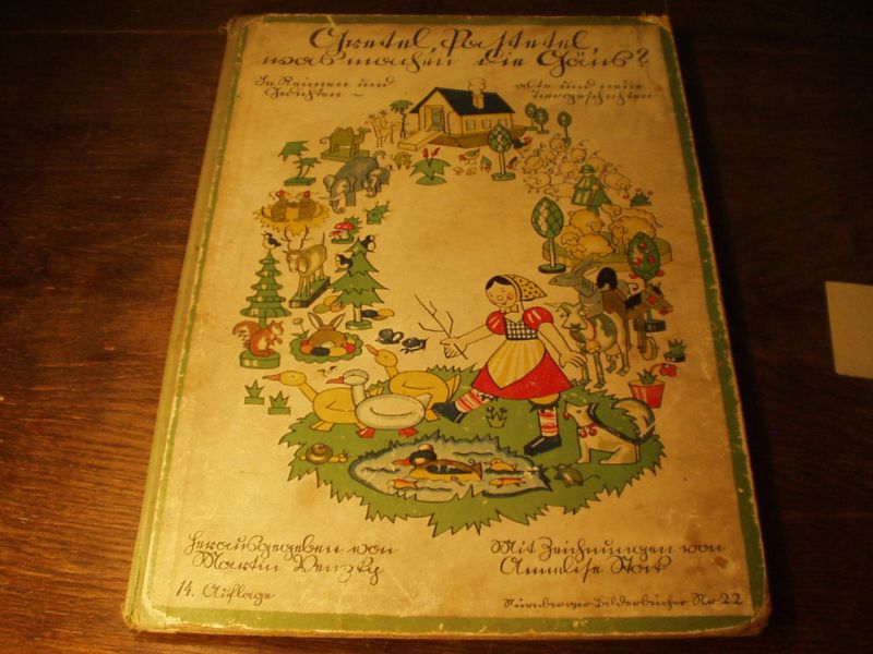 WENZKY, Martin: (Hrsg.) Gretel, Pastetel was machen die Gäns? In Reimen und Gedichten. Alte und neue Tiergeschichten. 14. Aufl. Oldenburg (Stalling), 1925. 33 x 24 cm. 20 S. mit farbigen Bildern von [Anneliese Stark.] farb. ill. OHLn. Einband angeschmutzt, Kanten bestoßen, Bindung gelockert, etwas fingerspurig, hinterer fliegender Vorsatz fehlt. = Nürnberger Bilderbücher Nr. 22. Seltenes Bilderbuch.