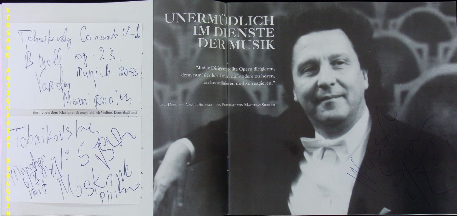 SINAISKY, Vassili (Dirigent) + MAMIKONIAN, Vardan (Pianist): 2 eigenhändig signierte und datierte Autogrammkarte. Mit den Moskauer Philharmonikern. München (Philharmonie), 6.10.1993. 8 x 12,5 cm. 2 Karteikarte in Programmheft. Zusätzlich auf dem Portrait des Dirigenten signiert und datiert. 16 S. mit zahlr. Abb. OKart. leicht gewellt. = Winderstein Konzerte. Vassily Sinaisky (* 20. April 1947 in Abez, Republik Komi) ist ein russischer Dirigent und Pianist. Er ist seit 2020 Chefdirigent der Janácek-Philharmonie Ostrava. Vardan Mamikonian is an Armenian pianist, and also a naturalised French citizen. (Wikipedia)