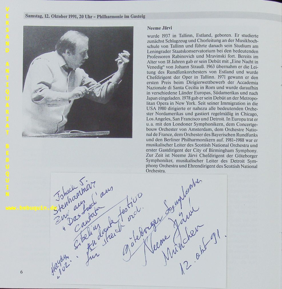 HARDENBERGER, Hakan (Trompeter) + JÄRVI, Neeme (Dirigent): 2 eigenhändig signierte und datierte Autogrammkarten. Mit den Göteburger Symphonikern. München (Philharmonie), 12.10.1991. 8 x 12,5 cm. 2 Karteikarte in Programmheft. 2 Eintrittskarten anbei. 12 S. mit zahlr. Abb. OKart. = Münchener Mozart Konzerte. Håkan Hardenberger (* 1961 in Malmö) ist ein schwedischer Trompeter. Durch sein Spiel inspirierte er auch neben den oben Genannten andere Komponisten wie die Österreicher HK Gruber und Kurt Schwertsik zu neuen Kompositionen, letzteren zu Divertimento macchiato (2007). Hardenberger gilt als der führende Trompeter in der klassischen und Neuen Musik unserer Zeit. Neeme Järvi (* 7. Juni 1937 in Tallinn) ist ein in Estland geborener Dirigent. Er ist seit 1987 US-amerikanischer Staatsbürger. (Wikipedia)