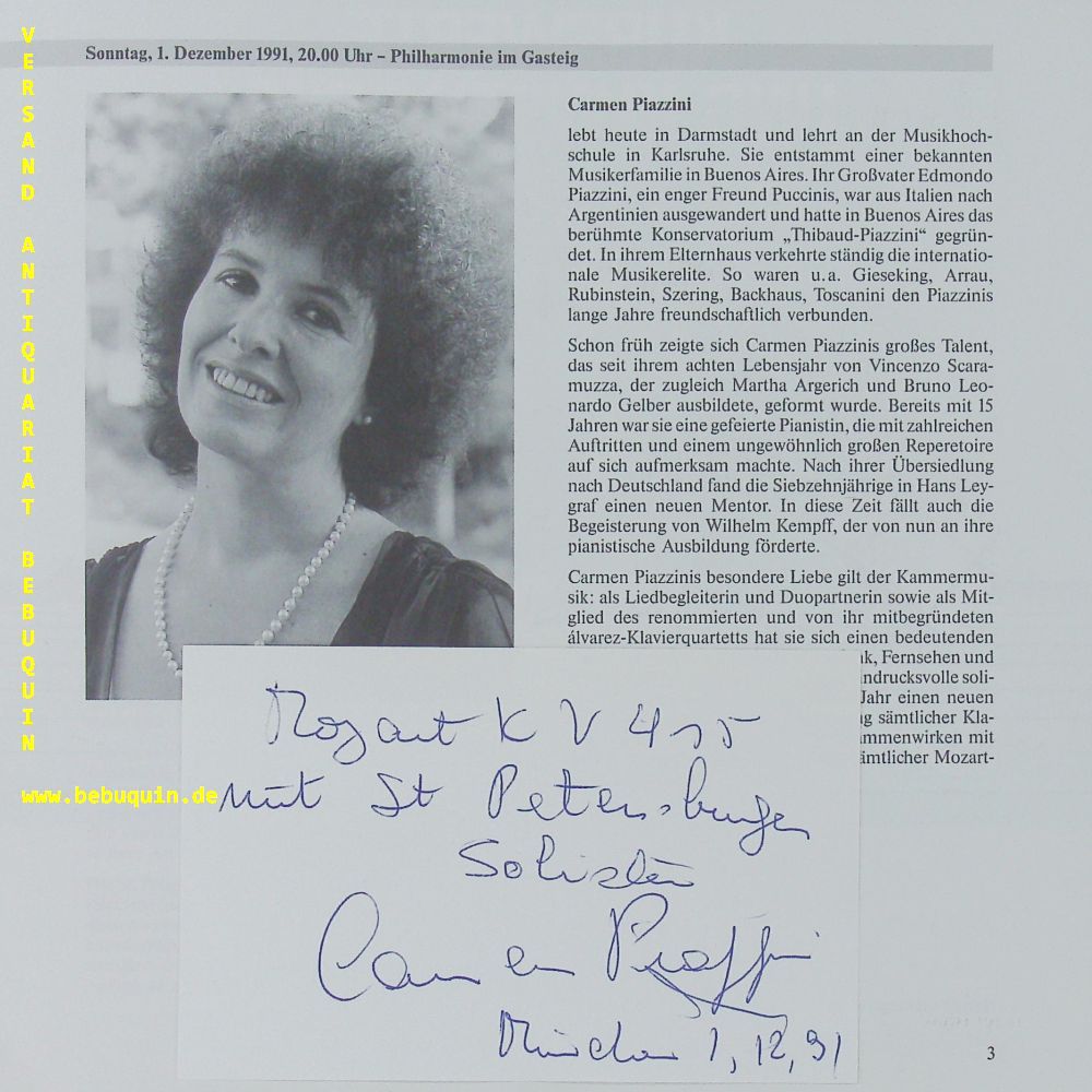 PIAZZINI, Carmen (Pianistin) + GANTVARG, Michail (Dirigent): 2 eigenhändig signierte und datierte Autogrammkarten. Mit den Petersburger Solisten. München (Philharmonie), 1.12.1991. 8 x 12,5 cm. 2 Karteikarte in Programmheft. 2 Eintrittskarten anbei. 12 S. mit zahlr. Abb. OKart. = Münchener Mozart Konzerte. Carmen Piazzini (* 1939 in Argentinien) ist eine argentinische Pianistin. Ihr Repertoire reicht von Klassik über Romantik bis zur Moderne. (Wikipedia)