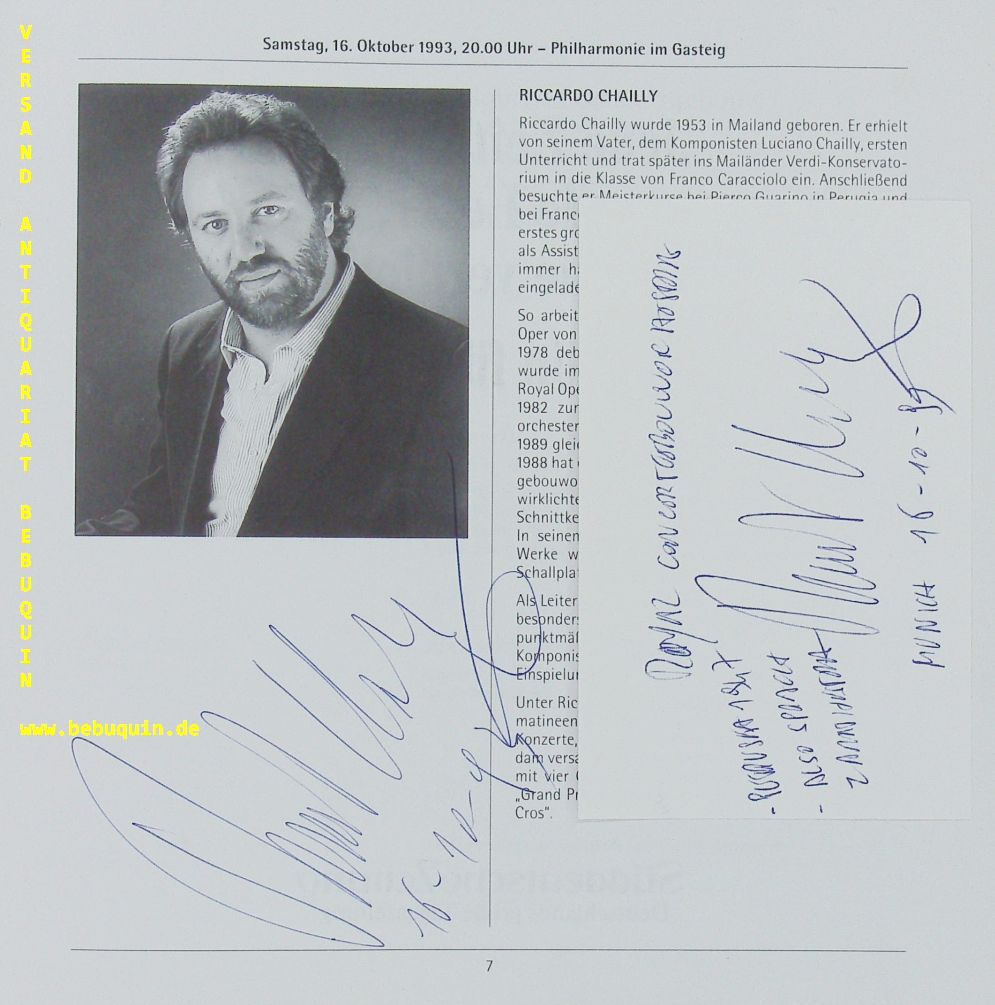 CHAILLY, Riccardo (Dirigent): eigenhändig signierte und datierte Autogrammkarte. Mit dem Königlichen Concertgebouw Orchester Amsterdam. München (Philharmonie), 16.10.1993. 8 x 12,5 cm. Karteikarte in Programmheft. Darin auch am Portraitfoto eigenhändig signiert und datiert. 12 S. mit zahlr. Abb. OKart. 2 Eintrittskartenm anbei. = Münchener Mozart Konzerte. Riccardo Chailly (* 20. Februar 1953 in Mailand) ist ein italienischer Dirigent. Er ist seit 2015 Musikdirektor der Mailänder Scala. Zuvor war er von 1988 bis 2004 Chefdirigent des Concertgebouw-Orchesters in Amsterdam und von 2005 bis 2016 Gewandhauskapellmeister in Leipzig. (Wikipedia)