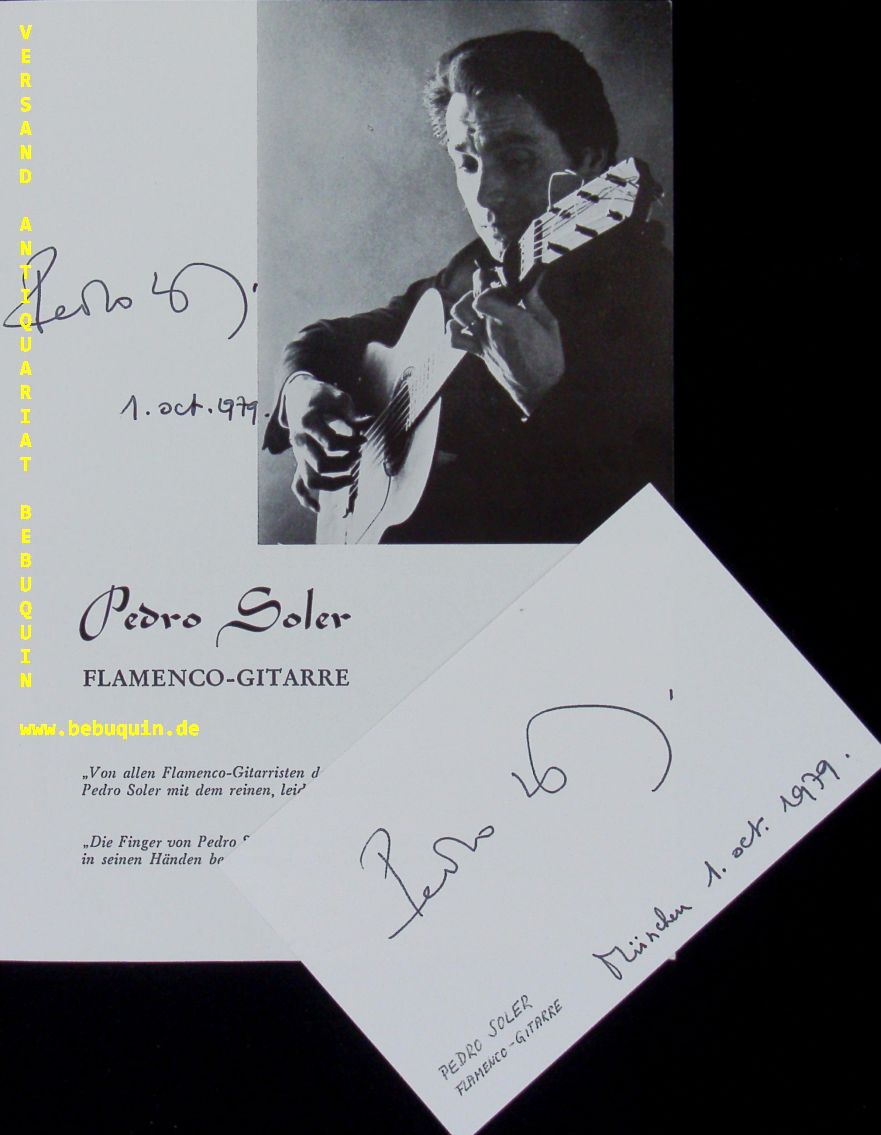 SOLER, Pedro (Gitarre): eigenhändig signierte und datierte Autogrammkarte. München (Marienplatz), 1.10.1979. 8 x 12,5 cm. Karteikarte mit Programmheft. Dieses ebenfalls eigenhändig signiert und datiert. Pedro Soler (* 8. Juni 1938 in Narbonne) ist ein französischer Gitarrist des Flamenco. (Wikipedia)