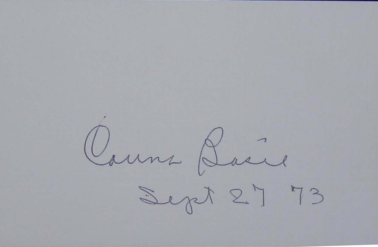 JAZZ.– BASIE, Count (Pianist): eigenhändig signierte und datierte Autogrammkarte. München (Kongressaal), 27.9.1973. 8 x 12,5 cm Karteikarte. Count Basie, geboren als William Allen Basie (* 21. August 1904 in Red Bank, New Jersey; † 26. April 1984 in Hollywood, Florida) war ein US-amerikanischer Jazz-Pianist, Organist, Komponist und einer der bedeutendsten Bandleader des Swing. (Wikipedia)