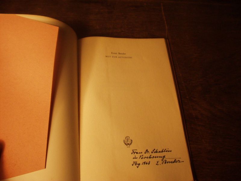 BENDER, Ernst: Mut zur Autorität. Karlsruhe (Braun), 1956. 44 S. OKart. EA mit einer persönlichen signierten Verfasserwidmung auf Vortitel.